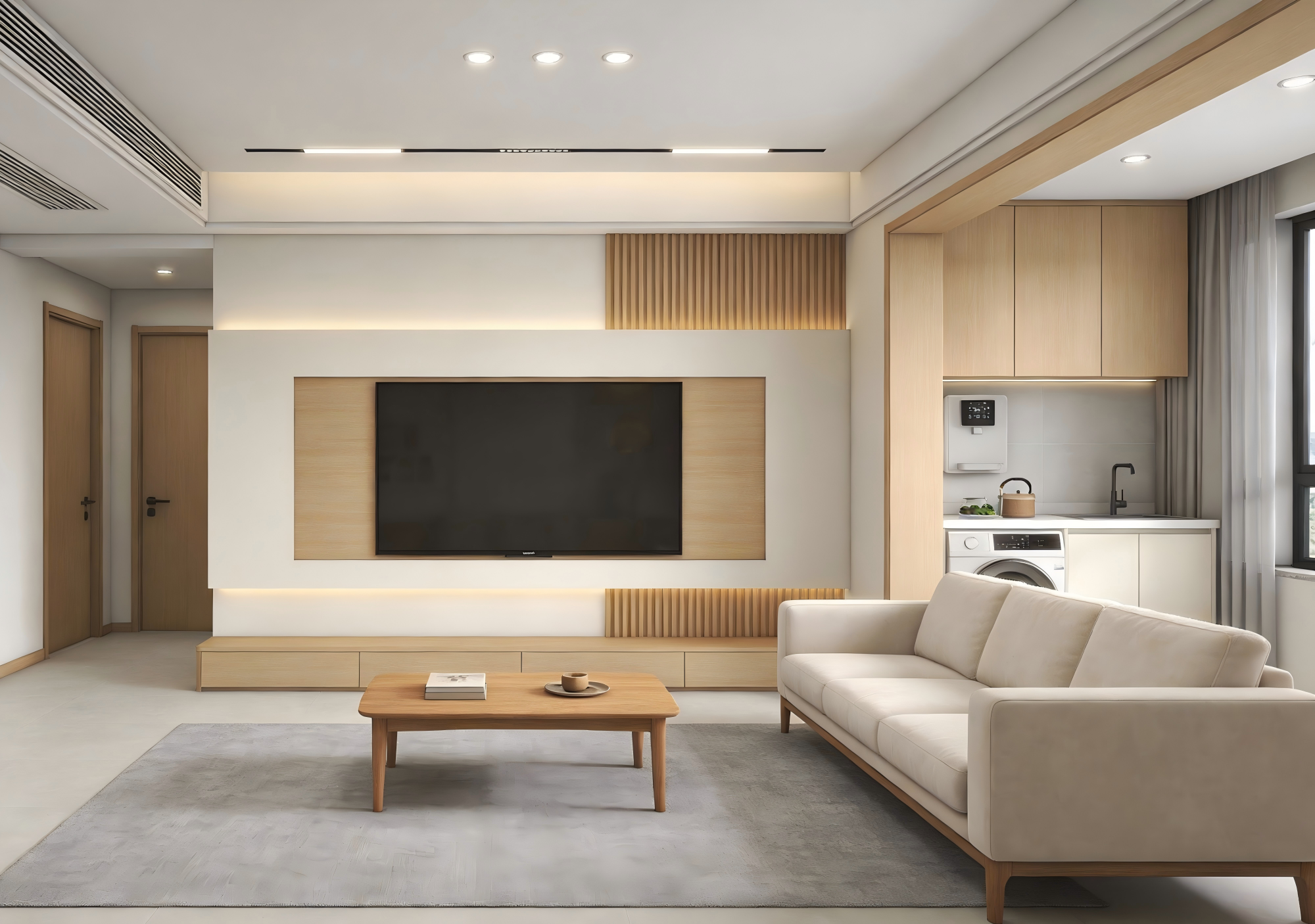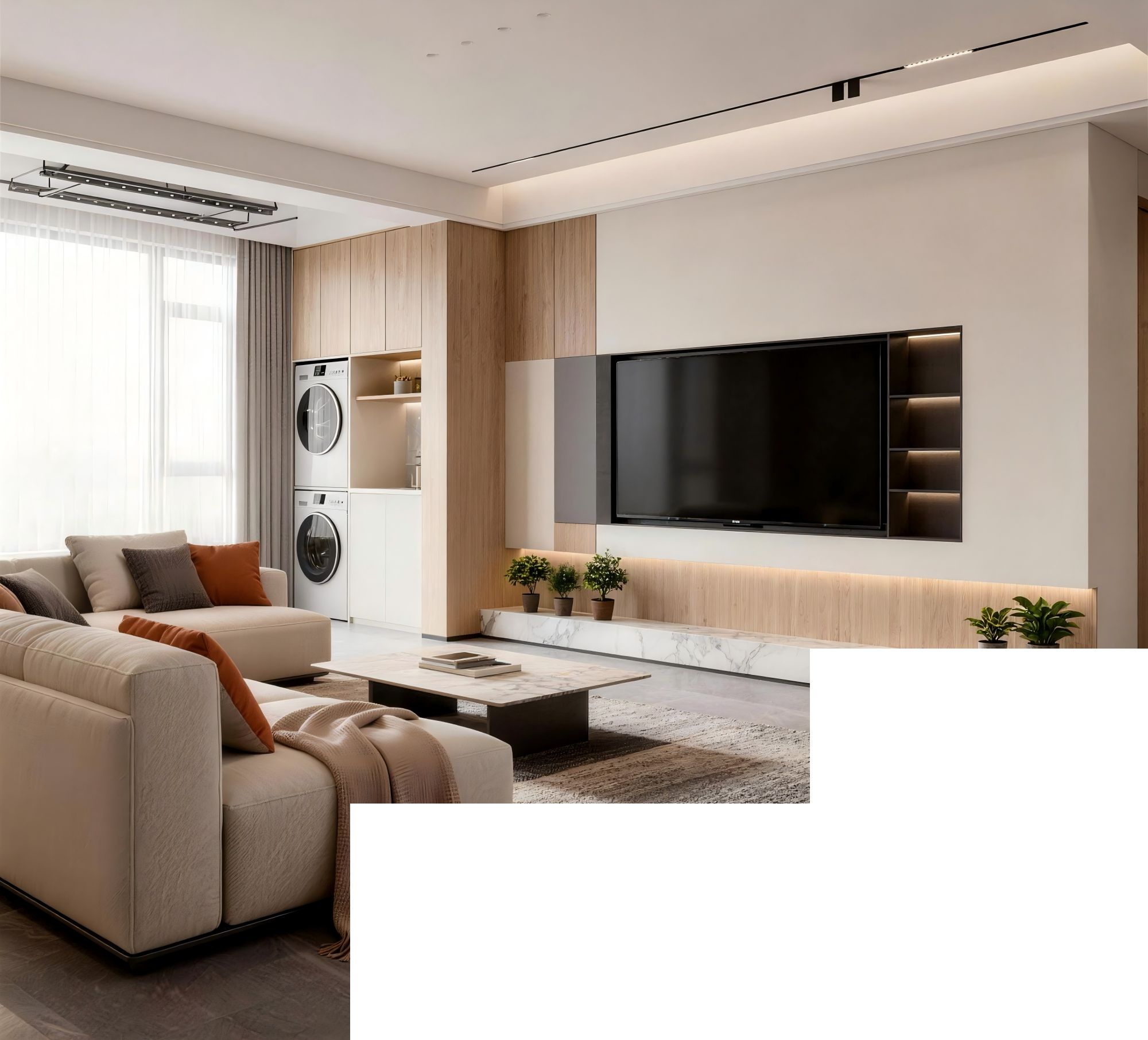 HDB living rooms are often visually fragmented due to beams or partition walls. The primary design task is therefore visual reconstruction. Within the constraints of limited space, custom cabinetry should function as an extension of the walls rather than standalone furniture—softening structural intrusions and creating visual continuity. At the same time, smart home integration enhances functionality, while maintaining a clean, streamlined aesthetic.